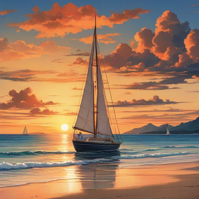 @jsup !gen beautiful sunset on the beach, clouds, sailboat, watercolors painting style, best quality