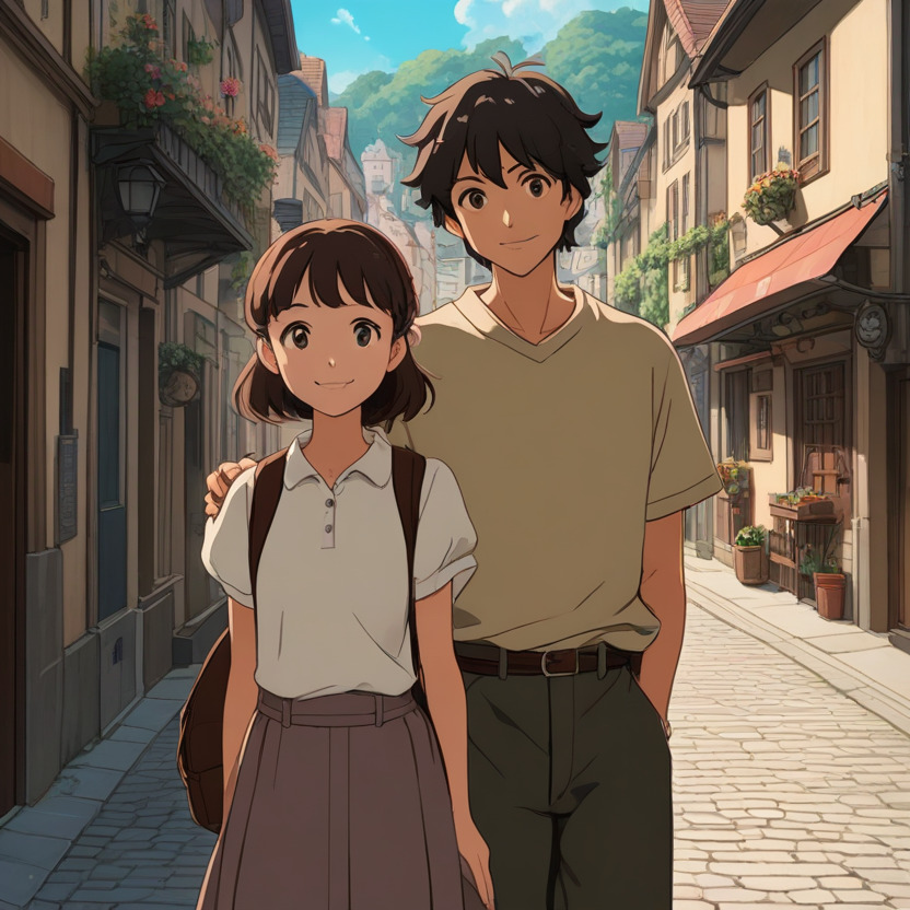 boy and girl standing on a european street, side by side, cute face, smile, best quality, masterpiece, (style:ghibli)